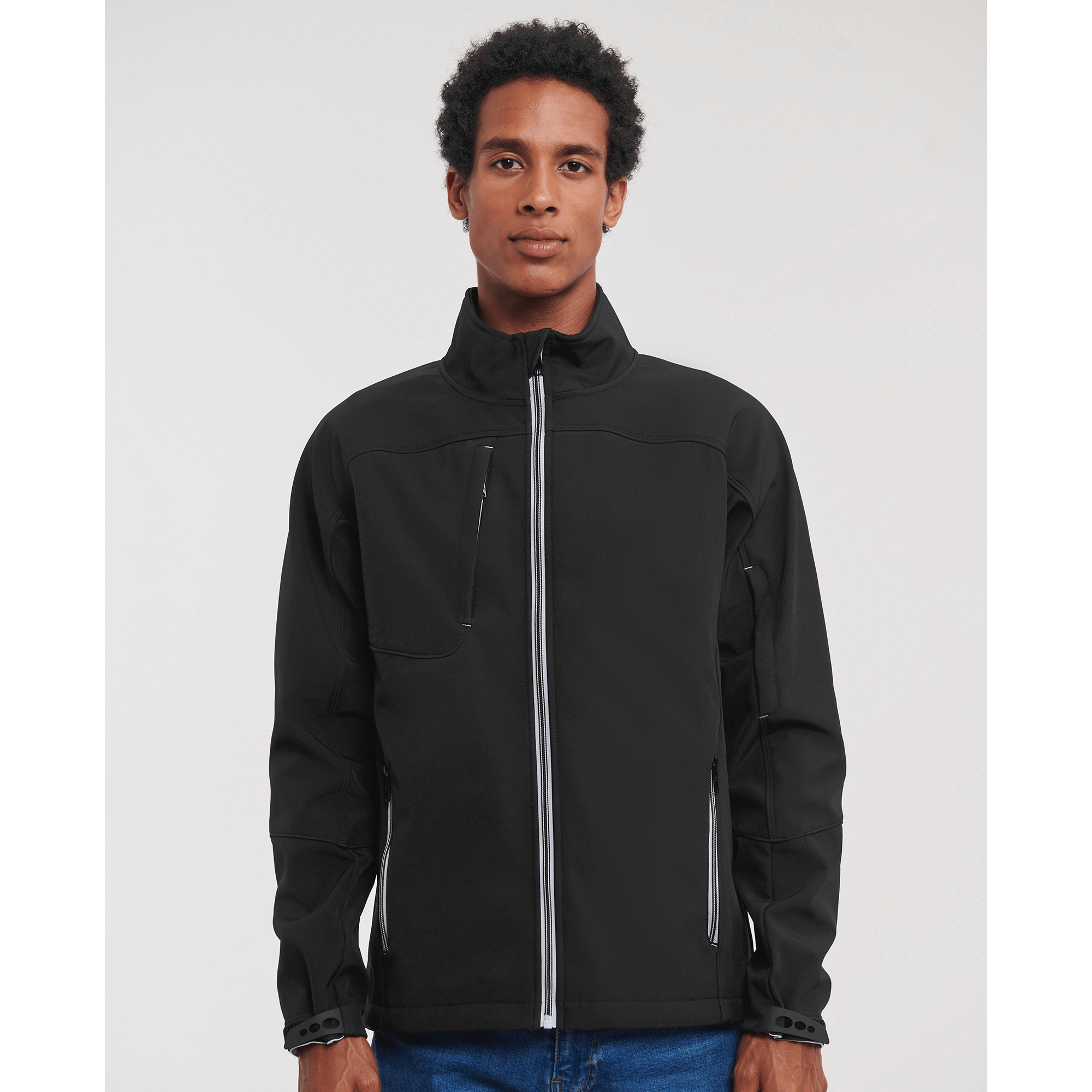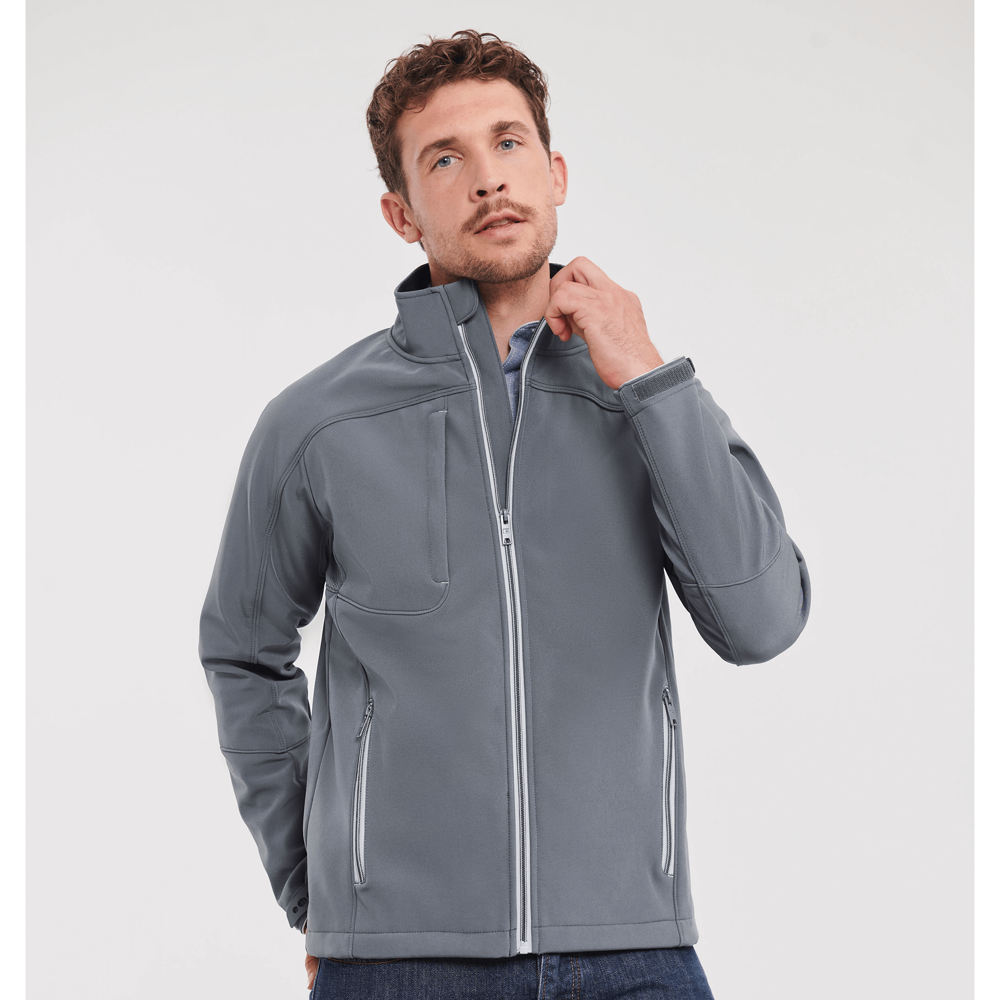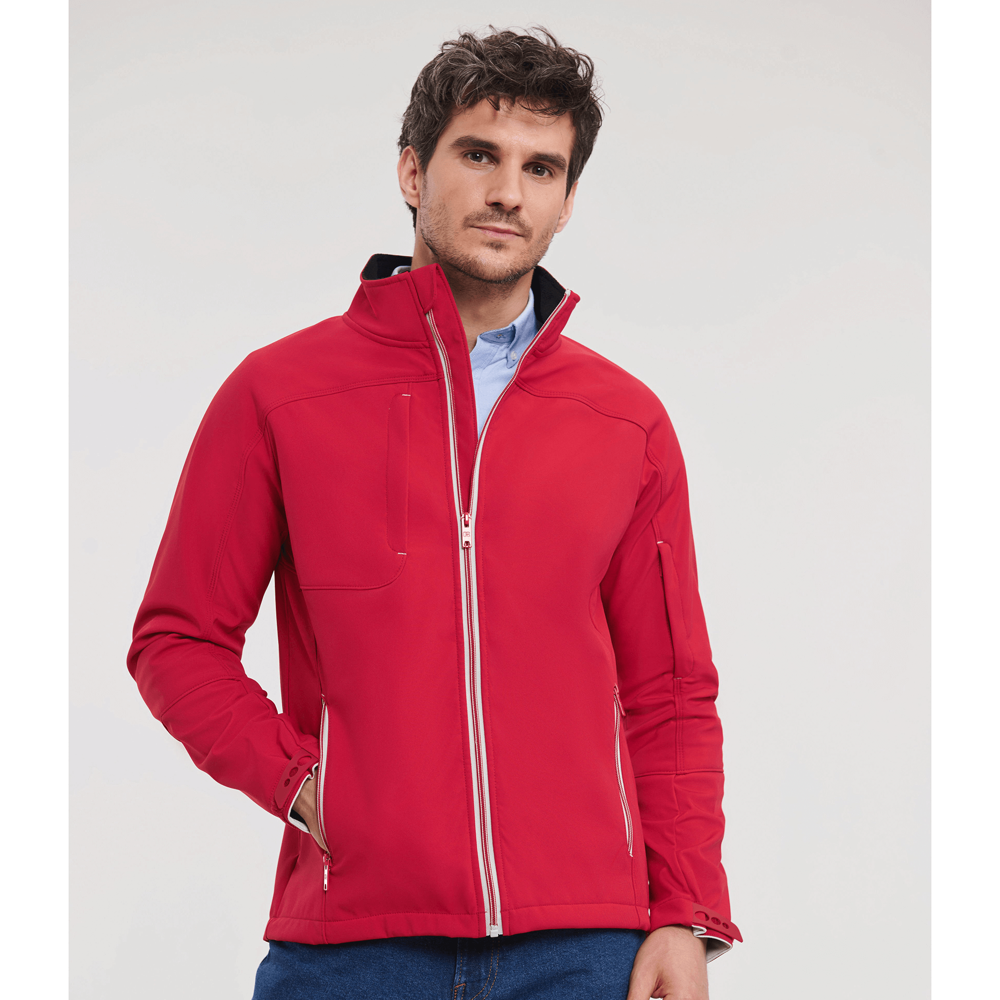 waterproof to 5.000 mm and breathability of 5.000 g/m² per 24 hours, windproof, fluorine and PFC free, contemporary classic fit, contrasting zips and accents for a refined look, high moisture vapour transfer with hydroshell air panels at armpits for enhanced movement and breathability, covered zipped pockets: one at chest and one at sleeve, protecting chin guard, stand up collar and inner storm flap to ward off wind and draught, adjustable sleeve hems with injected cuff tabs and loop Velcro, inside front honeycomb jersey lining and generous mesh media pocket, seamless shoulder parts for higher comfort and maximum space for decoration, high performance DWR fabric with hydrophobic membrane, treated with Bionic-Finish® Eco (3 layer softshell jacket)